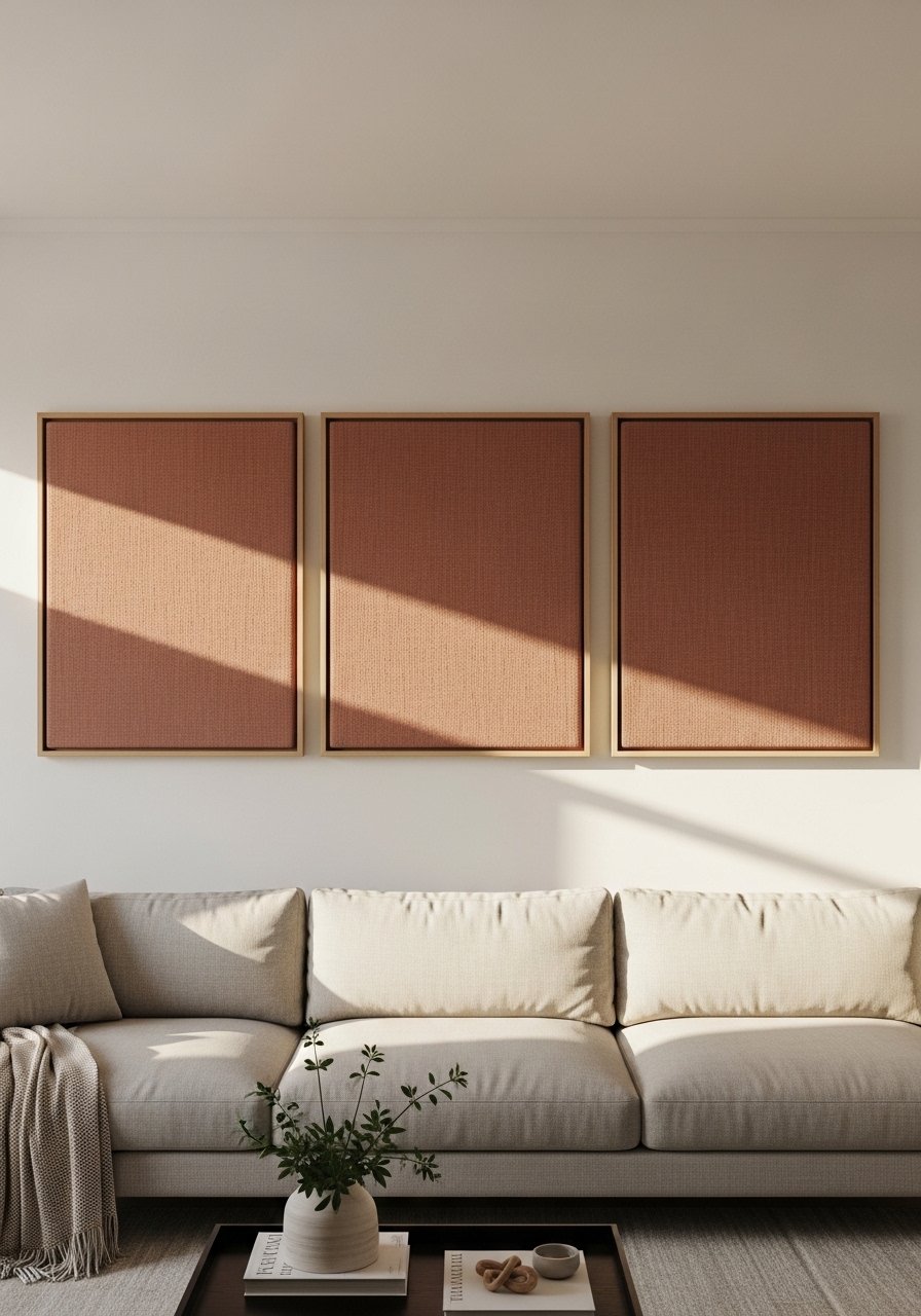 I stretched tactile fabric over frames to create big art without breaking the bank. Choose 3 panels for an odd-number grouping. Budget $40 to $150 for the set. Common mistake, picking busy fabric. Solid or subtly patterned fabric reads more expensive. I used staple gun heavy duty and plain upholstery fabric yardage. Photos show scale well. Up close it feels like gallery work.