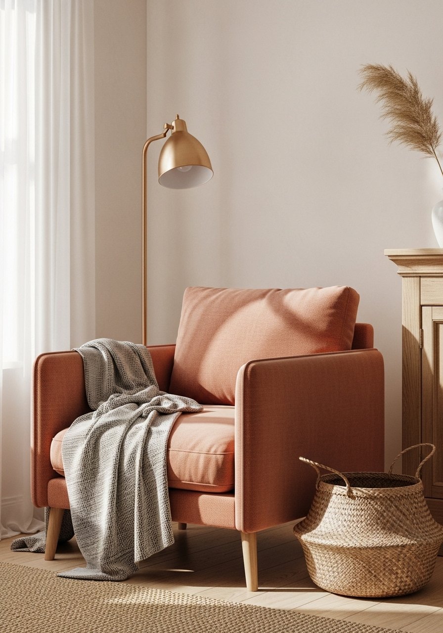 I kept walls, large furniture, and rugs neutral, then added a terracotta armchair as my 10 percent accent. That ratio keeps the room grounded while giving personality. Budget depends on the accent piece, $50 to $400. The common error is too many competing accents. Pair the bold color with brass or natural wood finishes. I sourced an accent throw from velvet pillow covers set. In photos the pop reads dramatic. In real life it keeps the room calm.
