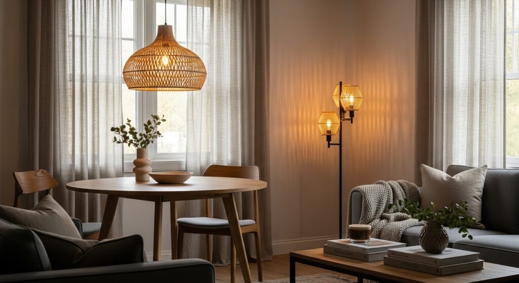 A: Yes. I pair natural textures with clean-lined fixtures. Use warm bulbs and add one rattan pendant or a paper lantern to bridge the styles. This rattan pendant shade works well in mixed rooms.