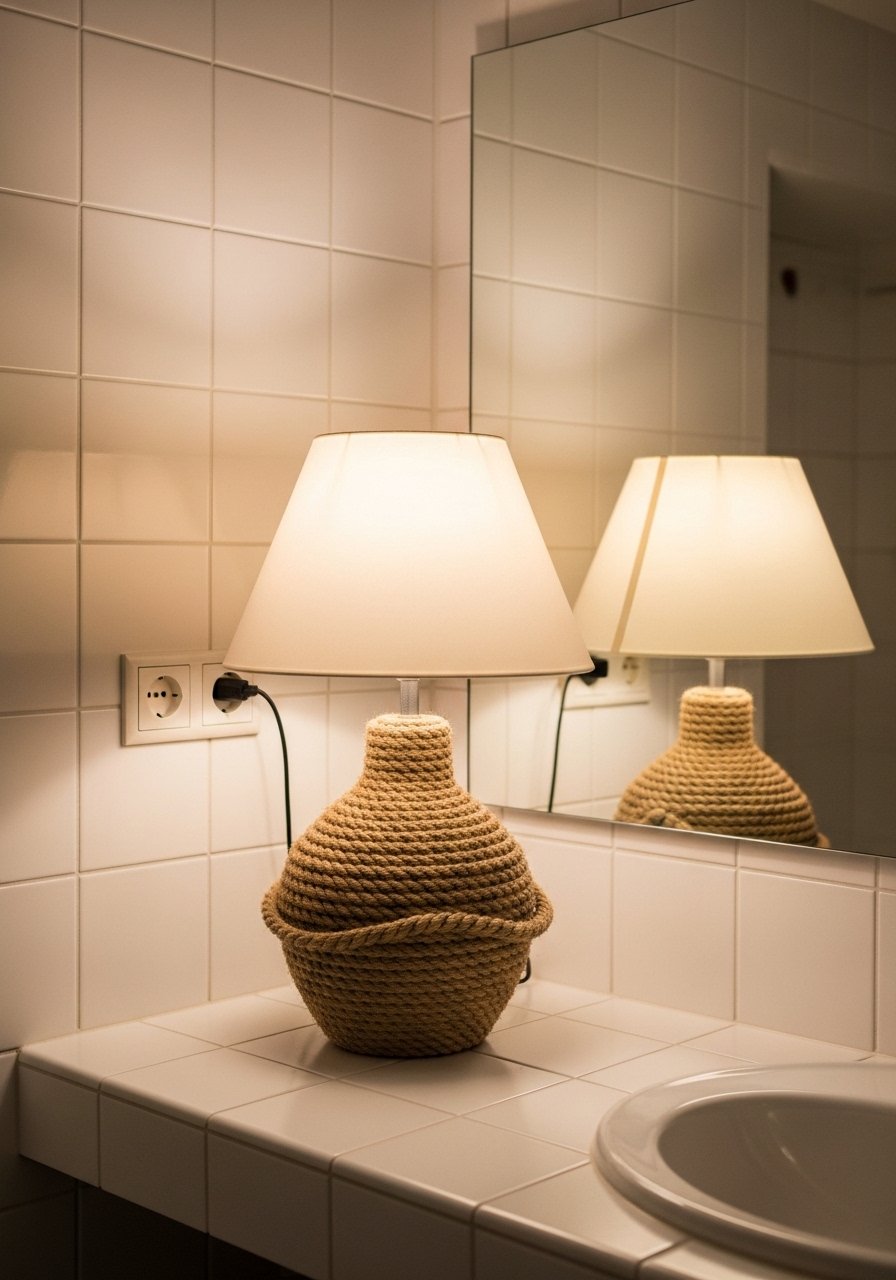 I wrapped a lamp base in natural rope to add texture in a small coastal bathroom. It feels layered and approachable. Works in coastal and boho bathrooms with wood accents. Budget is $25 to $60 if you DIY or buy prewrapped. In photos the rope reads perfectly. In humid bathrooms check the finish to avoid mildewing. Avoid rope that is too thick for small vanities. I used this rope-wrapped lamp base that matched my teak mirror.