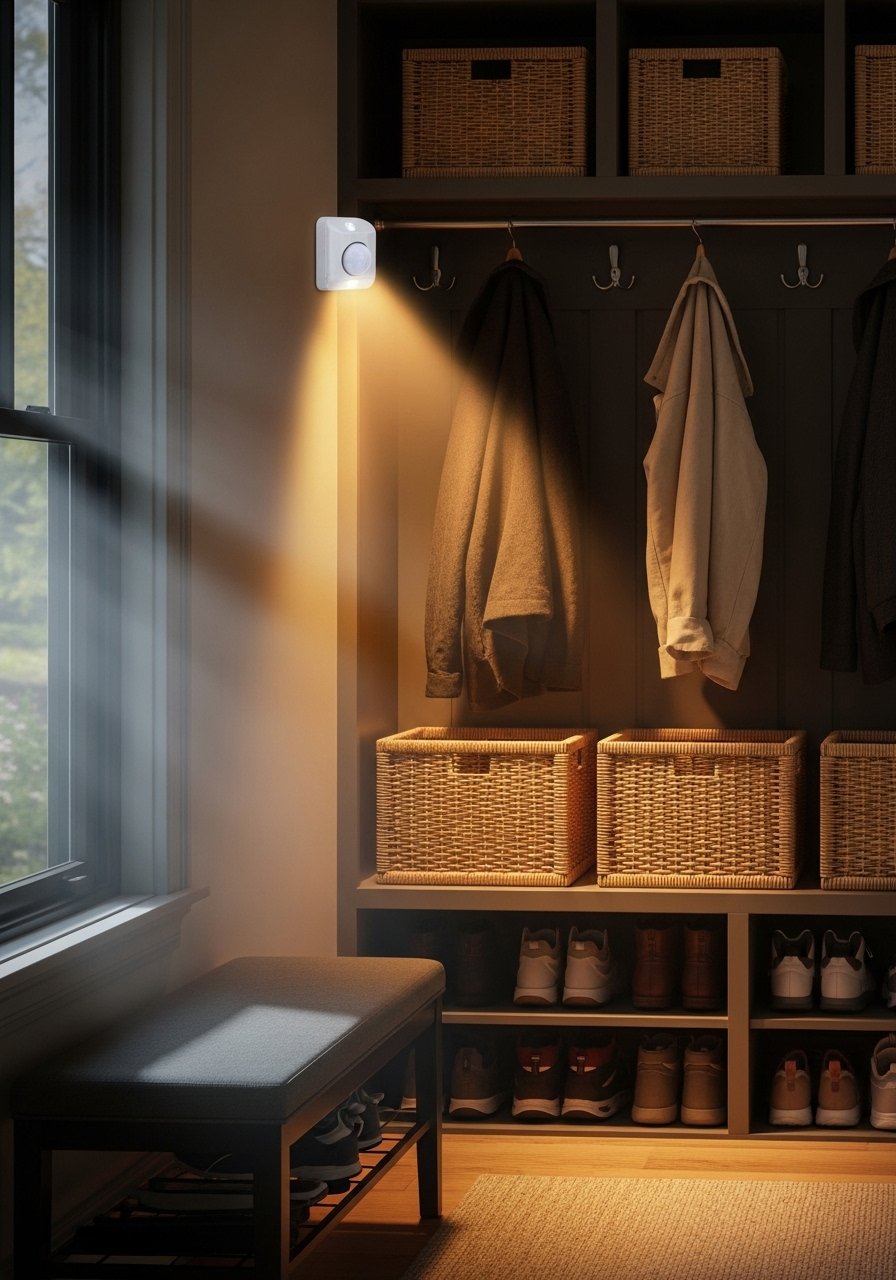 I installed a motion sensor puck in my mudroom closet and never fumble with a switch again. Great for mudrooms, coat closets, and pantries. Budget is $20 to $45. Photos sell the convenience. In small closets pick a sensor with a short delay. A common mistake is placing the sensor behind hanging clothes where it cannot see motion. I used this motion sensor closet light that mounted cleanly on a shelf.