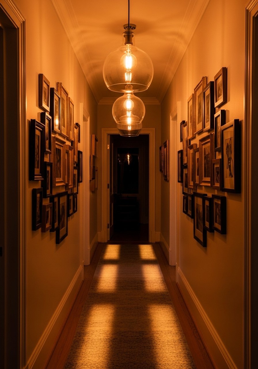 Vintage Filament Bulbs in Clear Fixtures for Eclectic Hallway