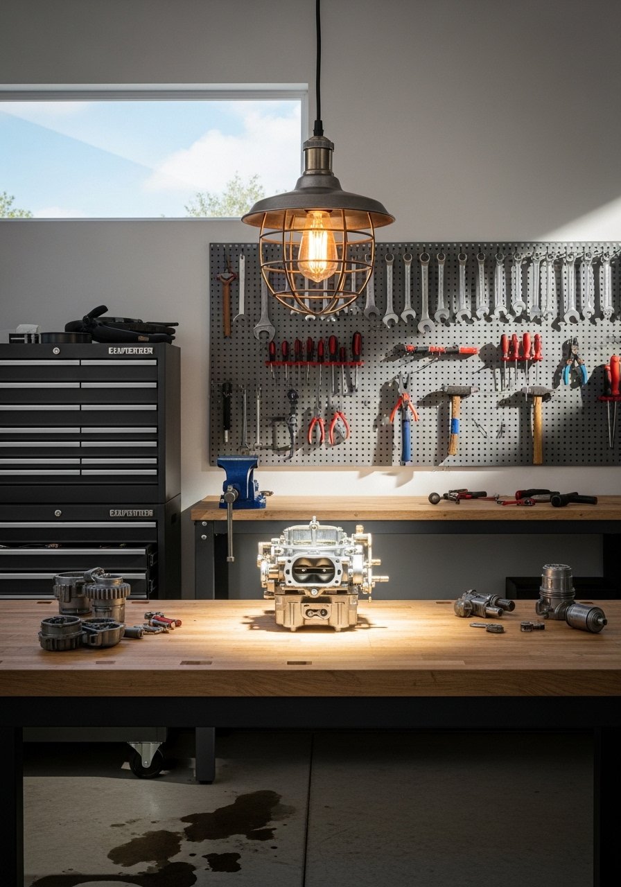 I added an industrial cage pendant above my workbench and the space became functional and stylish. It is ideal for workshops and hobby areas. Budget runs $40 to $120. Photos show the pendant as a focal point. In small garages choose a fixture with a directed beam. Avoid unshielded bulbs for glare. I installed this industrial cage pendant with a daylight LED for accurate color while working.