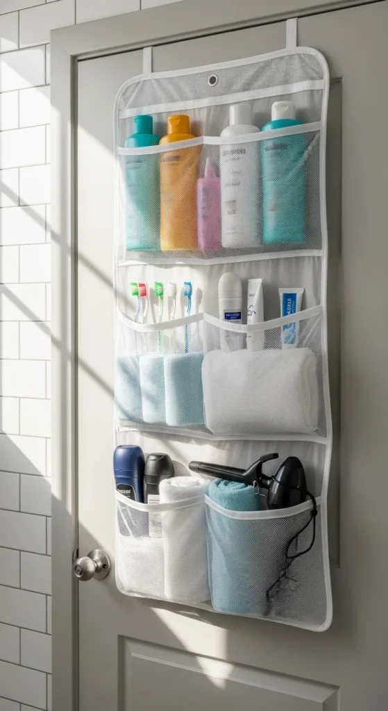 Bathrooms are usually short on space. An over-the-door caddy keeps shampoos, brushes, and towels off counters and floors. Fabric or plastic pockets work well for small items, while slim racks can hold bottles. Install it without drilling—removable hooks protect painted surfaces. Assign each pocket a category, like “daily use” or “kids’ items,” to keep things easy to find. This inexpensive hack maximizes storage and keeps your bathroom tidy every day.