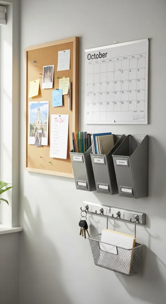 Centralize family schedules with a command center. Include a calendar, mail slots, hooks for keys, and a small basket for notes. Keep pens, markers, and sticky notes handy. Even a small wall section can work, making your home more organized and reducing morning chaos. Use inexpensive corkboards, clipboards, or DIY wooden frames. This system keeps all essential information in one place, cutting clutter from counters, tables, and fridge doors.