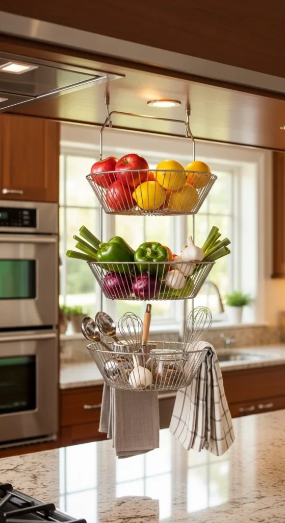 Use hanging baskets to free counter space in the kitchen. Mount baskets under cabinets or on wall hooks for fruits, vegetables, or utensils. Wire or wicker baskets are inexpensive and easy to install. Stack vertically to maximize small kitchens. This simple addition keeps items visible and accessible while adding texture and style. Pair with labels for fruit types or pantry categories for extra organization.