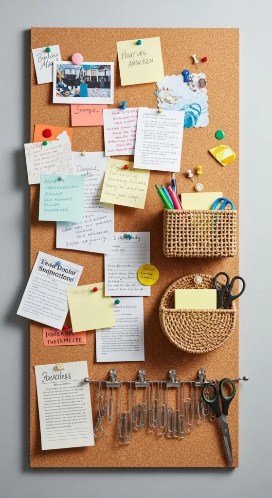 Turn a corkboard into a versatile organizer. Pin reminders, photos, or lists, and attach small baskets or clips for office supplies. Mount it above your desk or near the entryway to declutter surfaces. Corkboards are cheap, lightweight, and fully customizable with paint or fabric. Combine with hooks for keys or lanyards. This hack blends decoration with function, giving you a central spot for small items and visual reminders.