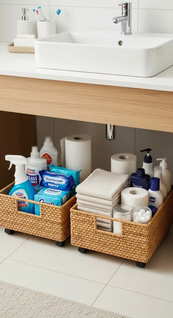 Under-sink areas are often wasted. Install rolling baskets to store cleaning products, extra toiletries, or towels. They make access easy and keep bottles upright, preventing leaks. Stack slim bins for maximum space. DIY options include repurposing small plastic drawers or old crates with wheels. This hack keeps items organized, visible, and easy to pull out, turning a messy space into a clutter-free storage zone.