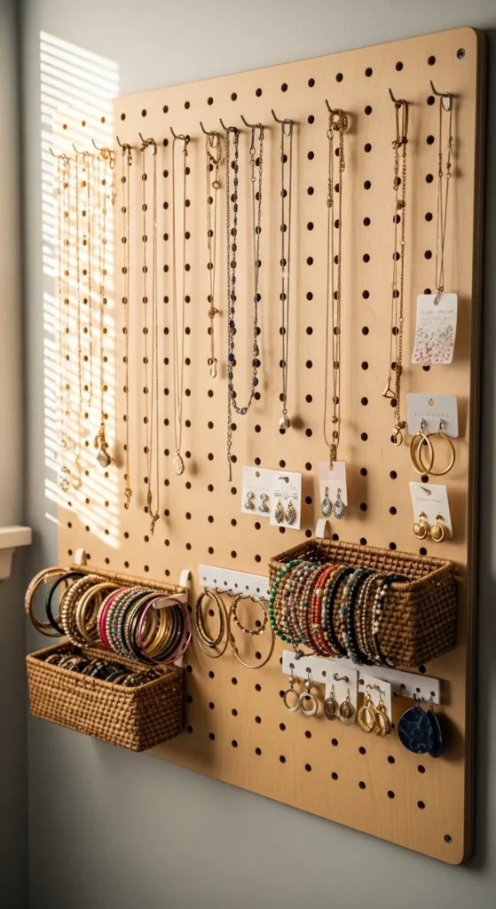 Keep accessories untangled with a pegboard jewelry organizer. Hang necklaces, bracelets, and earrings on hooks, small baskets, or clips. It frees drawer space and turns your collection into a visual display. Pegboards are inexpensive and easy to mount, and you can repaint or cover them with fabric for a personalized look. Adjust hooks or baskets as your collection grows. This hack keeps everything visible, prevents knots, and adds a decorative touch to your room.