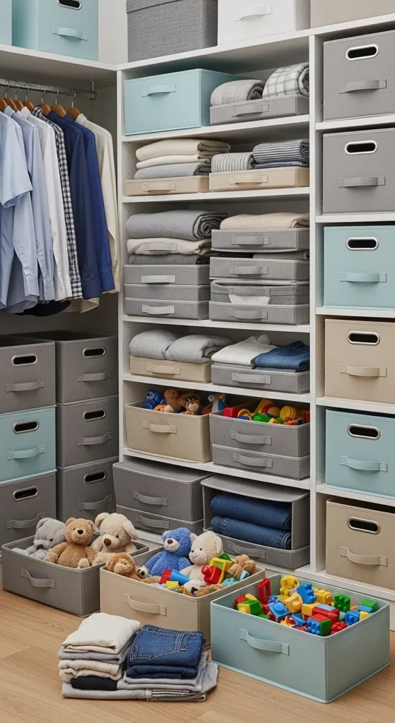 Fabric bins are lightweight, versatile, and inexpensive. Use foldable bins to store clothes, toys, blankets, or office supplies. They fit on shelves, inside closets, or under beds. Choose neutral colors for a minimalist look or bright patterns for fun. Foldable bins can be flattened when not in use, saving space. They’re easy to move around, making seasonal swaps or decluttering fast. This simple DIY-friendly solution keeps items contained and easy to access.