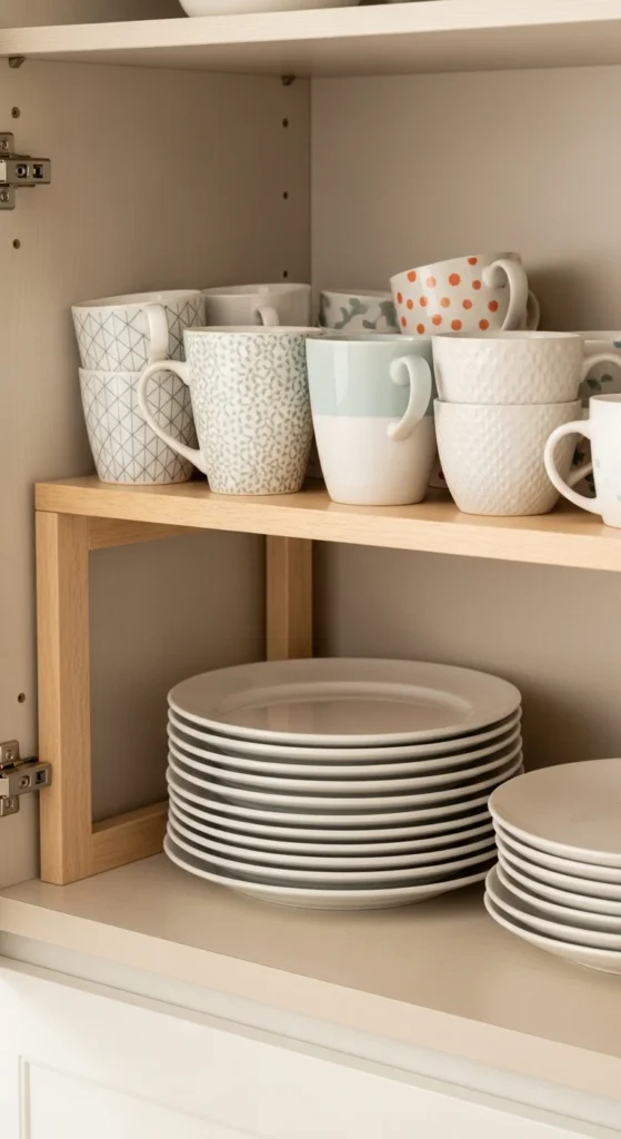 Double your cabinet space with riser shelves. Place small risers inside kitchen cabinets or bathroom cupboards to stack items without crowding. Use cheap acrylic or wooden risers, or DIY with repurposed boxes. Perfect for mugs, plates, or canned goods, they make items easy to see and grab. Riser shelves prevent wasted vertical space and reduce frustration from items hiding in the back. This inexpensive hack is perfect for small kitchens or pantries.