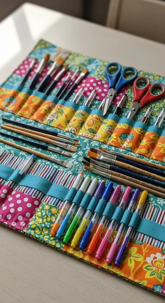 Keep craft tools portable with a roll-up organizer. Sew or repurpose fabric with pockets for brushes, markers, or knitting needles. Roll it up to tuck away neatly or carry between rooms. This DIY-friendly solution keeps items contained and prevents small tools from scattering. You can make one from old fabric scraps or inexpensive canvas. It’s perfect for small homes or shared spaces where storage is limited.