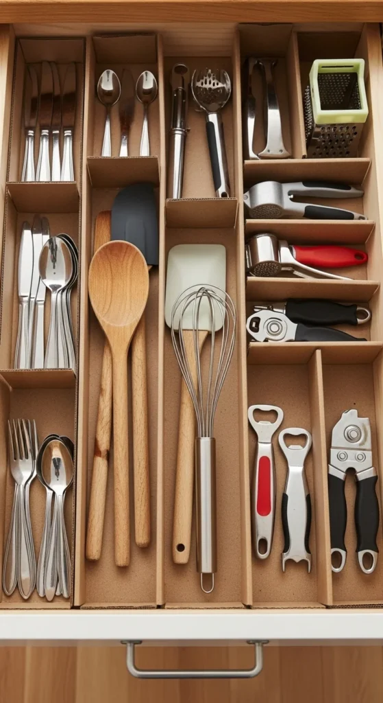Drawers can quickly turn into black holes. Create custom dividers from cardboard or cereal boxes. Cut strips to size and fold them into sections for utensils, makeup, or office supplies. Tape or glue to stabilize. This method is free and adjustable as your needs change. Dividing drawers keeps items in place and prevents rummaging. Label each section for extra clarity. Even small drawers become much more organized with this simple, inexpensive DIY.