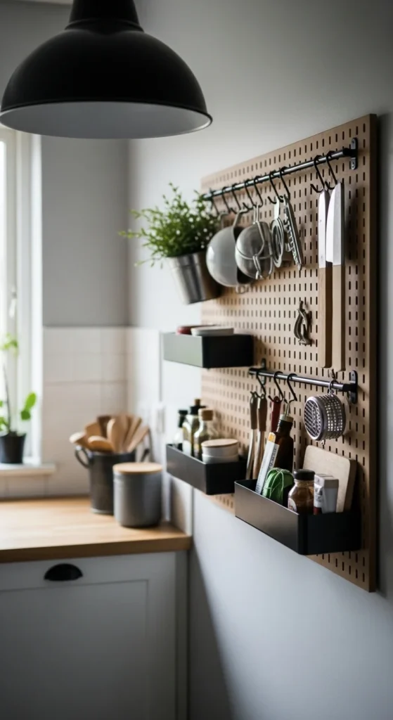 Pegboards turn walls into flexible storage hubs. Hang baskets, hooks, or shelves for craft supplies, kitchen utensils, or tools. Customize the layout anytime—you can move hooks or add shelves as needed. Paint the board to match your décor or leave it natural for a rustic feel. Pegboards work in small kitchens, home offices, or craft rooms, making items easy to reach while clearing counters. This vertical solution is inexpensive and reusable, perfect for tight spaces.