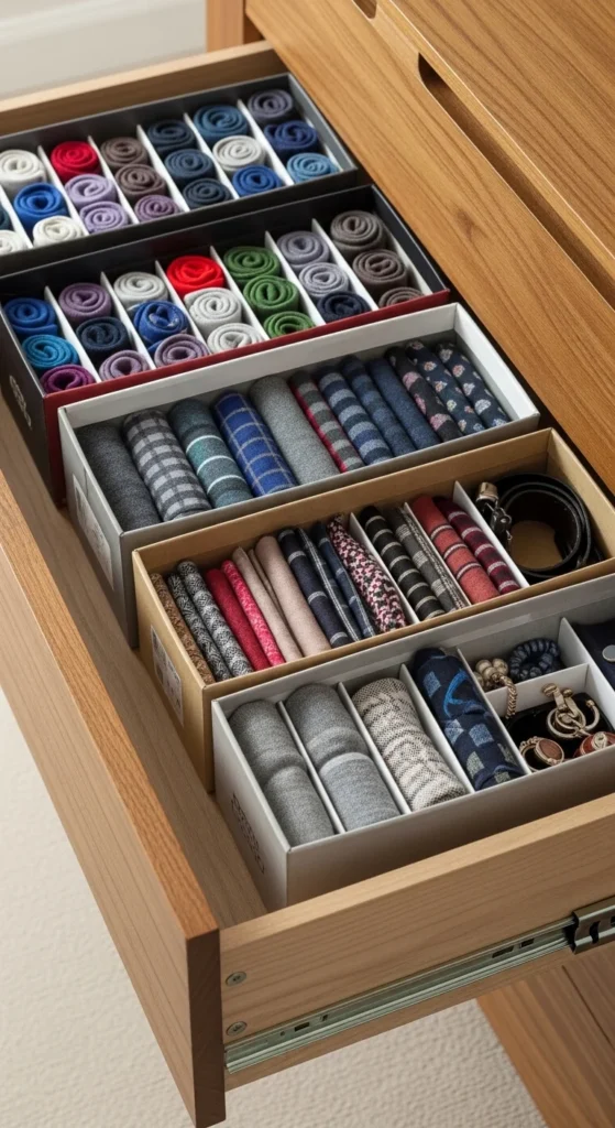 Repurpose shoe boxes to organize drawers cheaply. Cut them to fit inside drawers and create compartments for socks, accessories, or office supplies. Wrap in decorative paper or fabric for a polished look. This technique is zero-cost if you already have boxes at home and is fully customizable to your drawer sizes. Keeping small items separated reduces clutter and makes mornings easier when you know exactly where everything is.