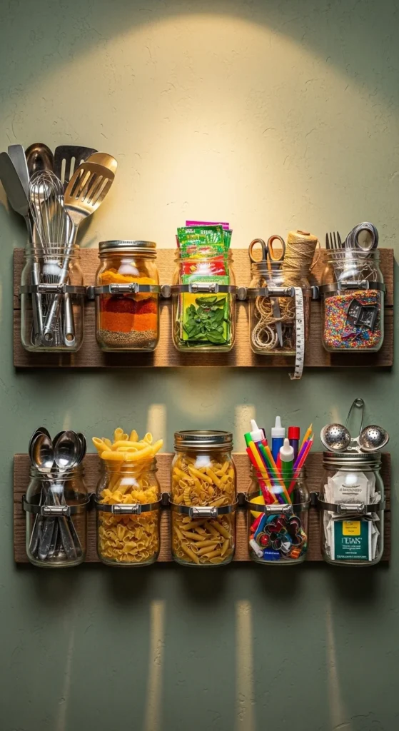 Glass jars aren’t just for jams—they’re versatile storage containers. Use mason jars for spices, office supplies, or craft items. Mount them under shelves or inside cabinets to save counter space. Label each jar for quick identification. For a rustic feel, use twine or painted lids. Repurposed jars are eco-friendly, low-cost, and reusable, giving a charming, organized look to your kitchen, craft room, or bathroom.