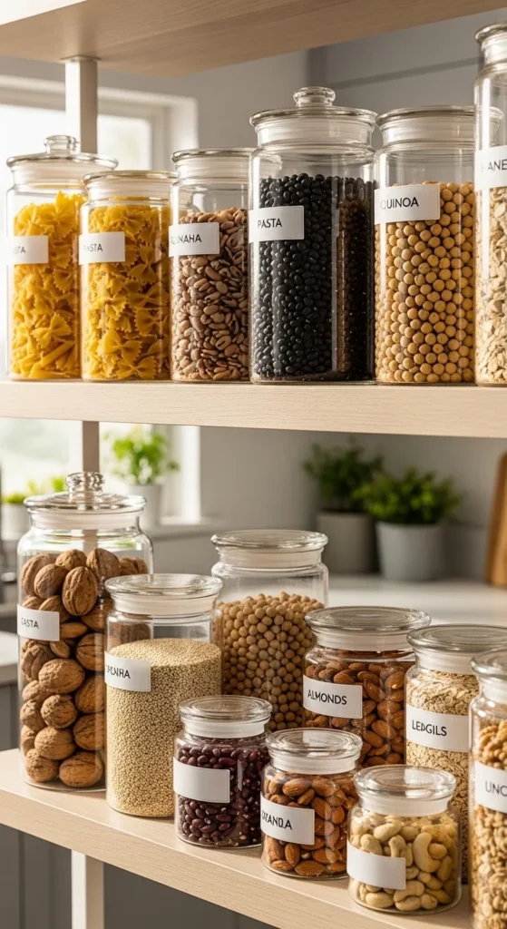 Cut clutter and plastic use with reusable containers. Store pantry items in jars, tins, or glass containers you already have. Repurpose old food jars for grains, pasta, or snacks. Label each container for easy identification. This approach is eco-friendly, budget-friendly, and keeps your kitchen neat. It reduces packaging waste and creates a visually appealing, organized pantry that’s simple to maintain.