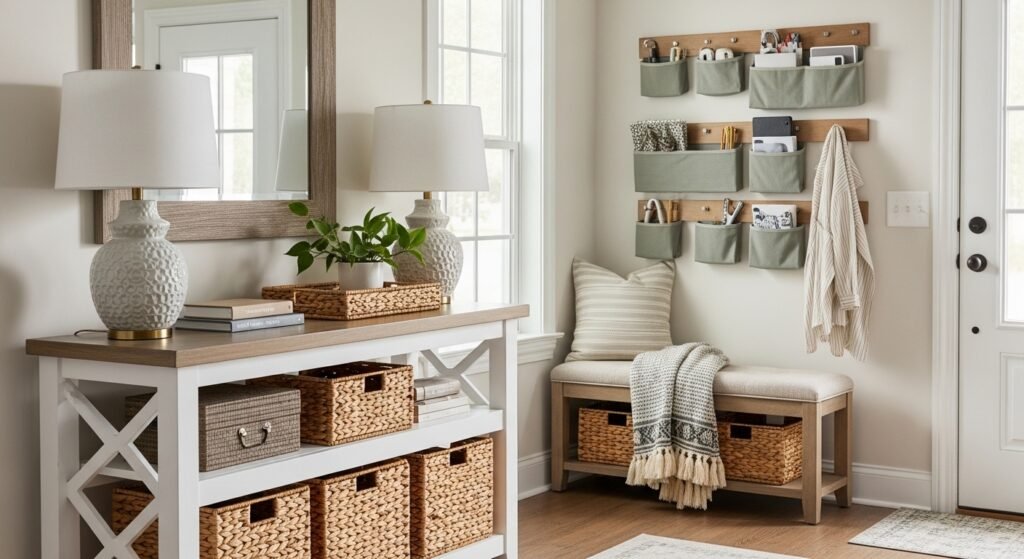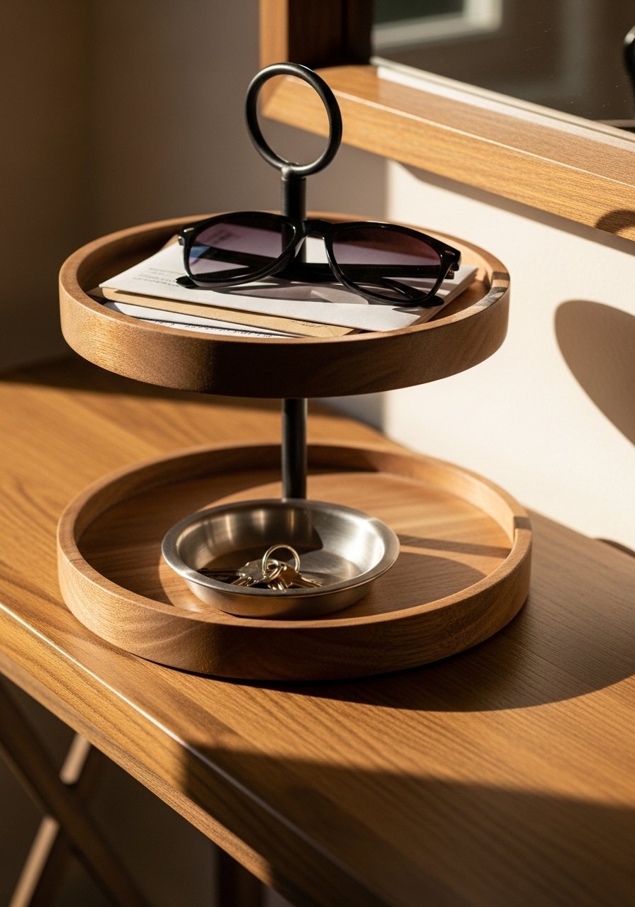 I replaced a single bowl with a tiered tray so mail stacks upright and small items have a dedicated dish. The visual is layered and tidy. Avoid trays with too many tiny compartments that turn into clutter. Budget $20-45. I use tiered organizer tray and a small ceramic catchall dish.