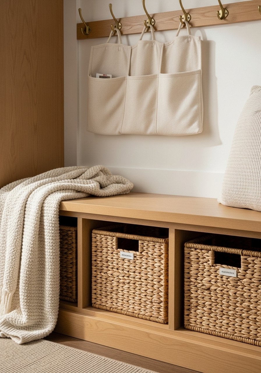 My entryway was a drop zone until I added a slim bench with two woven baskets underneath. It reads as minimal and modern. I use one basket for daily shoes and the other for reusable bags. Budget is $40-120 depending on bench choice. Avoid buying baskets that are too shallow. They look tidy in photos but overflow in real life. I linked my favorite woven storage baskets and a compact entryway bench.