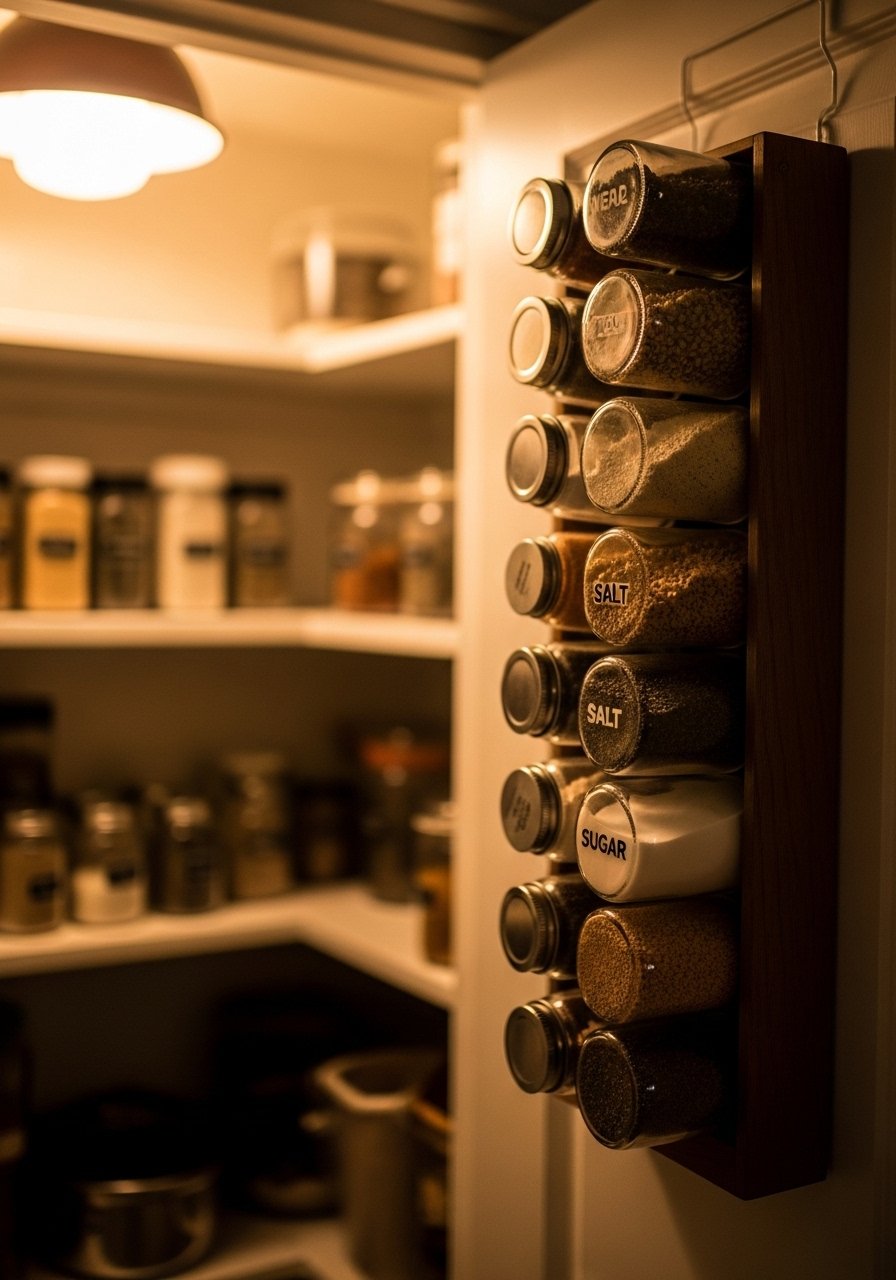 I discovered that mounting a slim vertical rack to the pantry door frees deep shelf space. It looks clean in photos and is actually easier to use when you line jars by height. In small kitchens it saves up to two shelves worth of room. My mistake was buying tiny jars that required constant refilling. Use 4-6 ounce glass jars and labels. Try this door spice rack and 4-ounce glass spice jars.