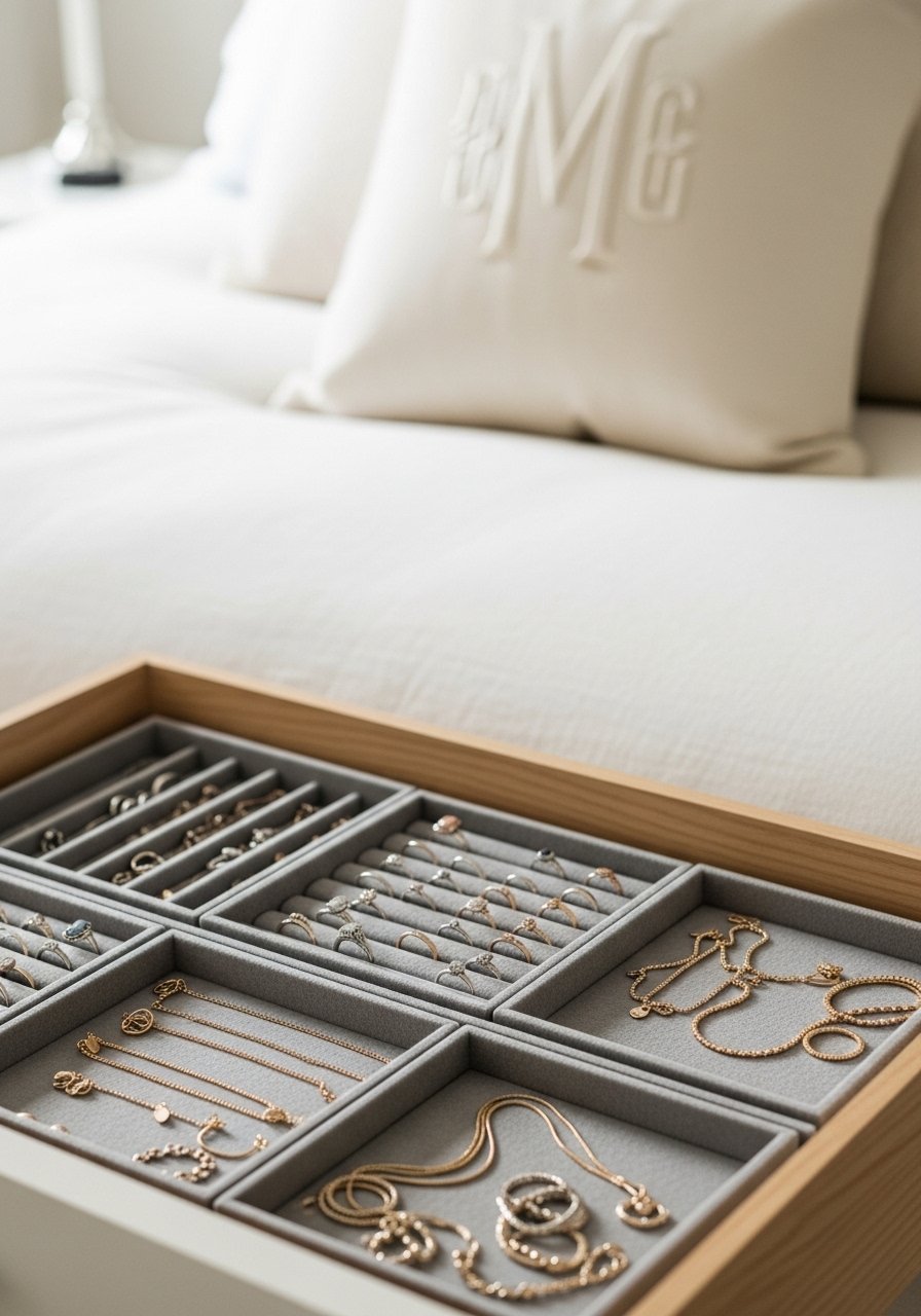 I used felt tray inserts to separate delicate jewelry. The visual is neat and you can see everything without digging. In photos it looks tidy. In reality tiny items can slip between gaps unless trays fit the drawer. Measure depth before buying. I use a 2×6 compartment layout and odd-numbered groupings for balance. Try felt drawer organizers and small jewelry travel trays.