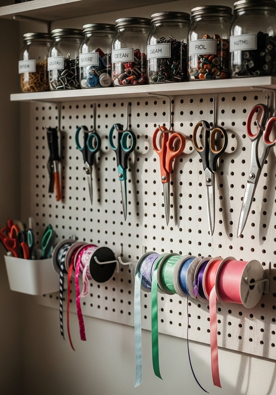 I painted a pegboard the same warm neutral as my wall and mounted it above my work table. It keeps tools visible and within reach. Photos always show pegboards tidy. In real life you must assign each hook a purpose or it becomes cluttered. My budget was $20-45. Use a mix of small baskets and hooks. I use metal pegboard hooks and a 24×16 pegboard panel.