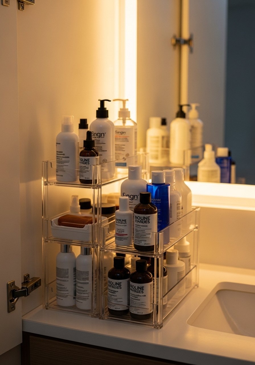 I installed tiered trays under the sink so bottles stand upright and you can see labels at a glance. In photos everything looks neat when bottles are uniform. Real life shows mismatched bottles unless you transfer to matching pumps. Budget $15-30. Don't cram trays too deep or items fall when you pull them out. Try under-sink tiered organizers and pump bottles for skincare.