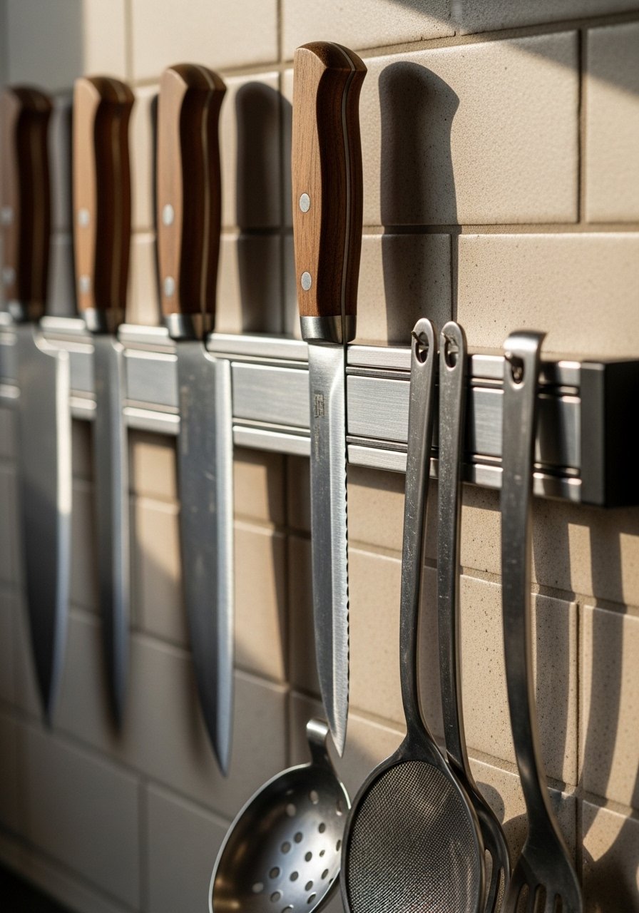 I wall-mounted a stainless steel magnetic strip to keep knives accessible and free up drawer space. It looks great against subway tile. In photos it reads professional. At home you must choose a strip rated to hold your heaviest knife. A weak strip will drop items. Budget $12-30. Pair with wood-handled knives for a warm contrast. I use this stainless magnetic knife strip.