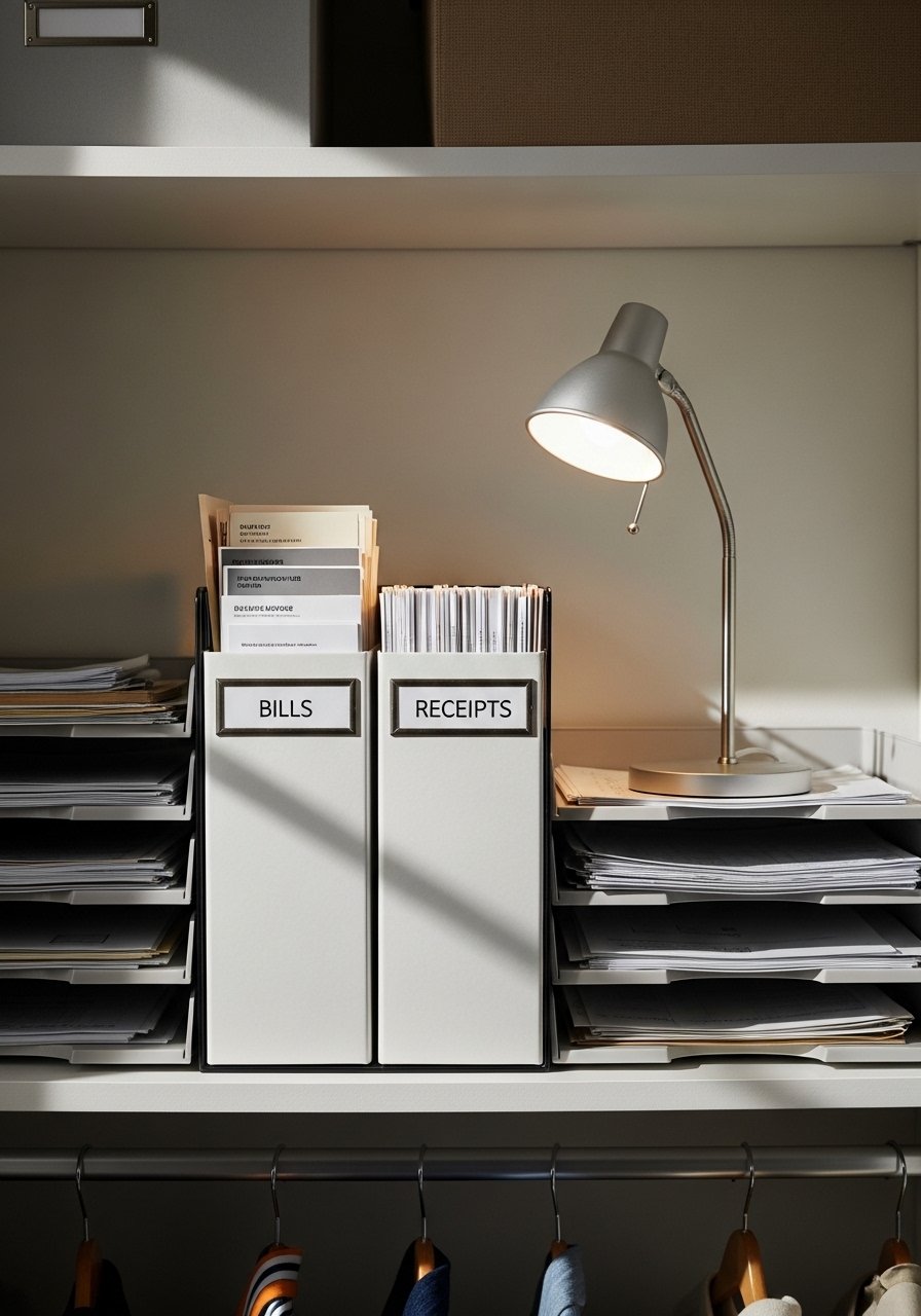 I turned an awkward closet shelf into a filing station using stackable file trays and magazine files. It tucks behind a curtain for a clean look. In tight apartments it keeps paper out of sight. The mistake I made was using too many categories. Limit to 6 broad folders and purge annually. Budget $20-40. I use stackable letter file trays and labeled magazine holders.