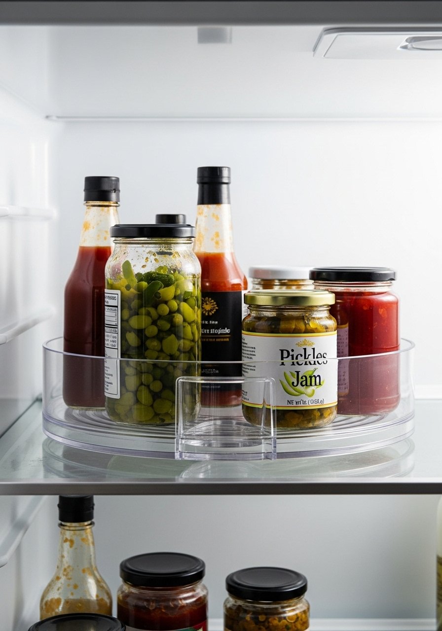A clear lazy Susan turned my back shelf into a usable spot. Condiments are no longer hidden. Photos make it look minimal. In real life greasy bottles slide unless you choose a tray with raised edges. For larger fridges use two rotating tiers. My picks are clear rotating lazy susan and non-slip shelf liner.