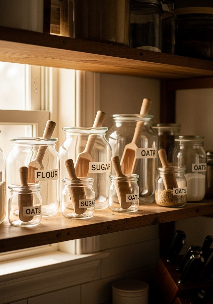 Match jar sizes for pantries: Use uniform jars. Clear canisters with lids keep labels readable.
