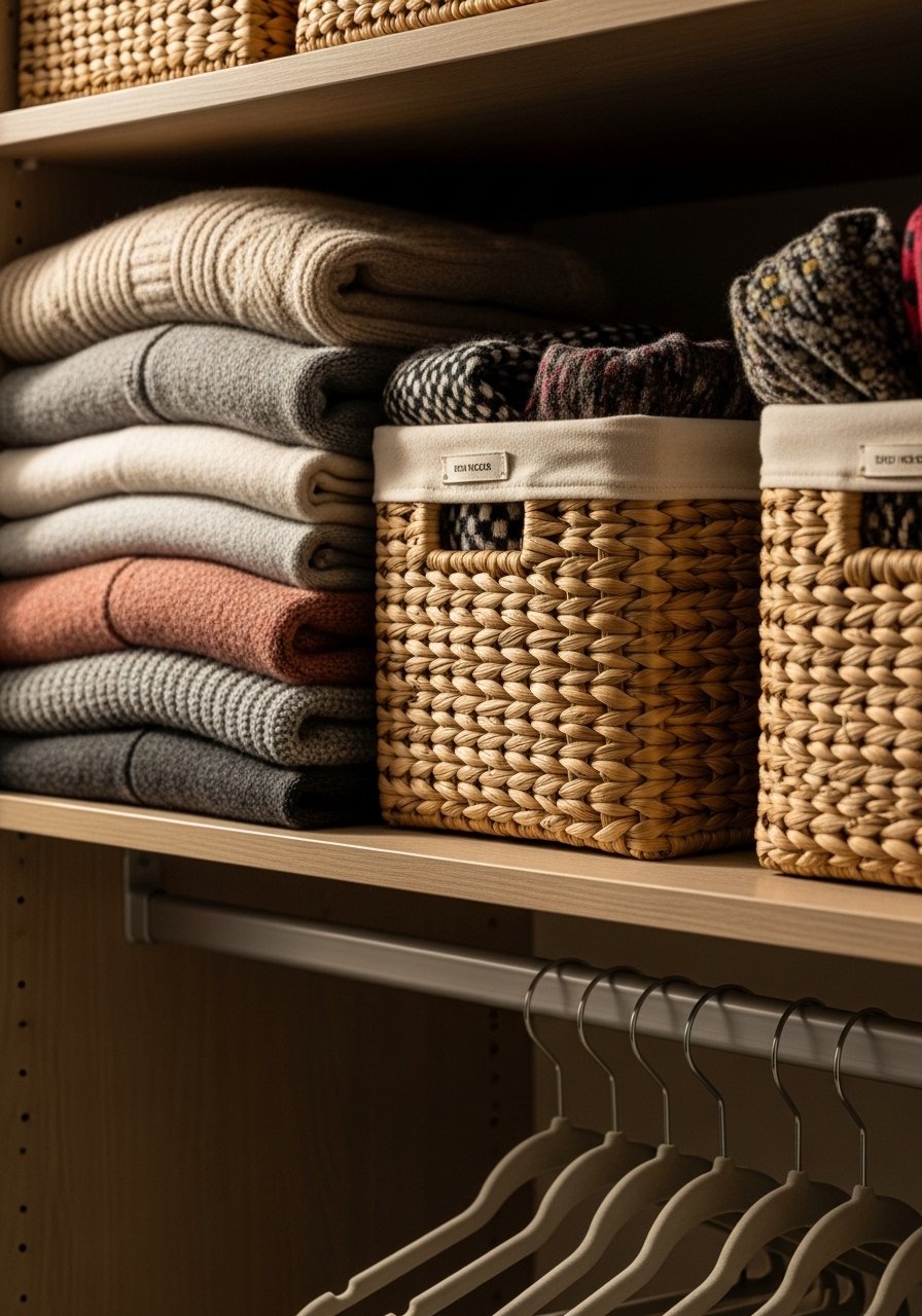 I layered open shelving, baskets, and matching slim hangers to make my closet look curated. The 60-30-10 color rule helps. Sixty percent neutrals, thirty percent mid-tone, ten percent accent. In photos it appears tidy. In practice use breathable baskets for wool. A common error is oversized baskets that hide items. I use slim velvet hangers and woven closet storage baskets.