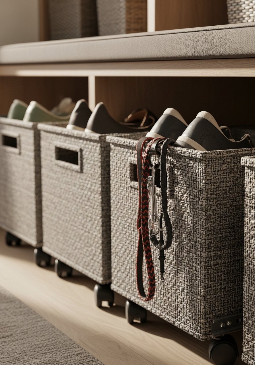 I installed pull-out bins under my bench so shoes stow quickly. It keeps the floor clear and looks tidy in quick smartphone photos. In real life you must measure bin height or they will scrape the drawer. Budget $30-70. Match bin material to your entryway vibe. I recommend pull-out storage bins and entryway shelf bench.