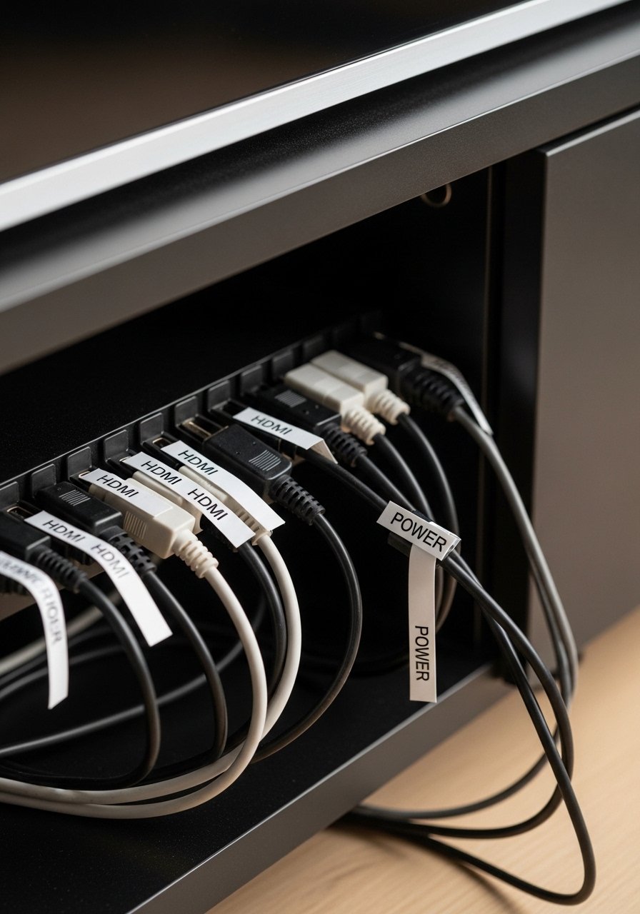 I used adhesive cord clips behind my TV to route cables along the cabinet edge. It cleans the silhouette without hard wiring. Photos look polished. At home use adhesive rated for your TV weight and surface. Test one clip before doing all. Budget under $15. I use adhesive cord clips and cable labels.