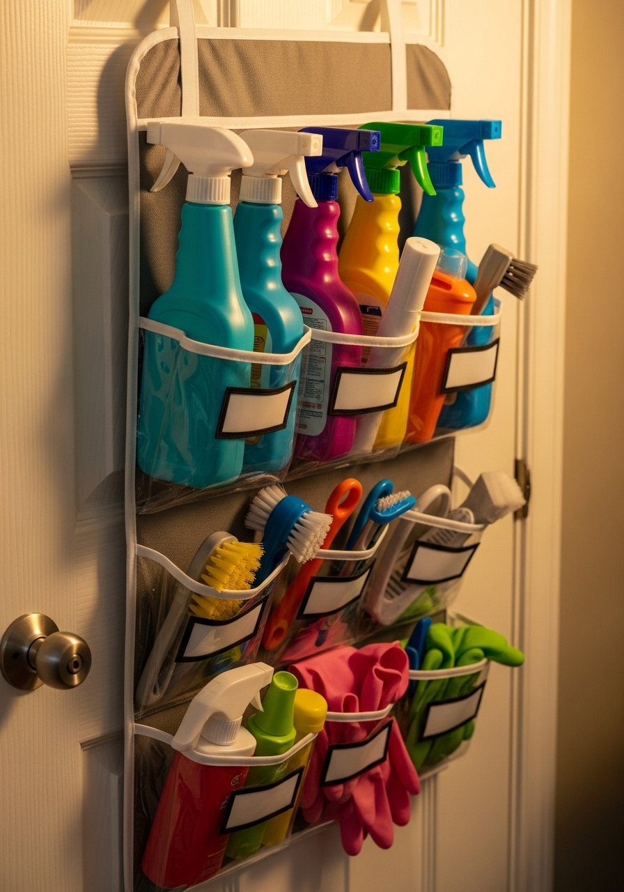 I repurposed an over-the-door shoe organizer for cleaning supplies. It frees up floor space and keeps sprays upright. In photos pockets look uniform. In reality heavy bottles can sag the fabric. Use bottles under 28 ounces and rotate heavier items to a lower shelf. I recommend over-the-door organizer with pockets.