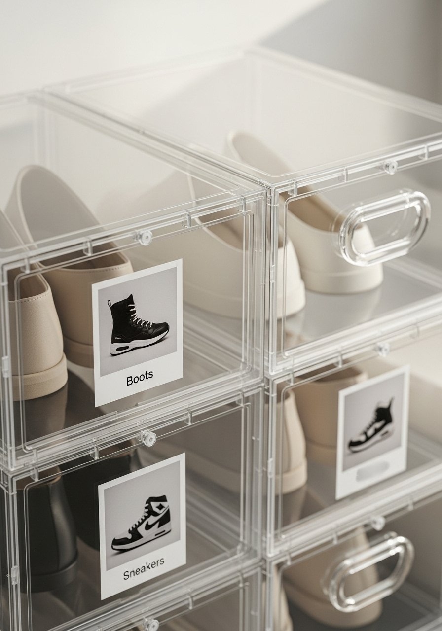 I labeled clear stackable shoe boxes with a tiny printed photo of the pair inside. It is faster than opening every box. Photos of the setup look ultra organized. In practice choose boxes with ventilation holes to prevent odor. Budget $25-60 for a set. I use clear stackable shoe boxes and a label printer.