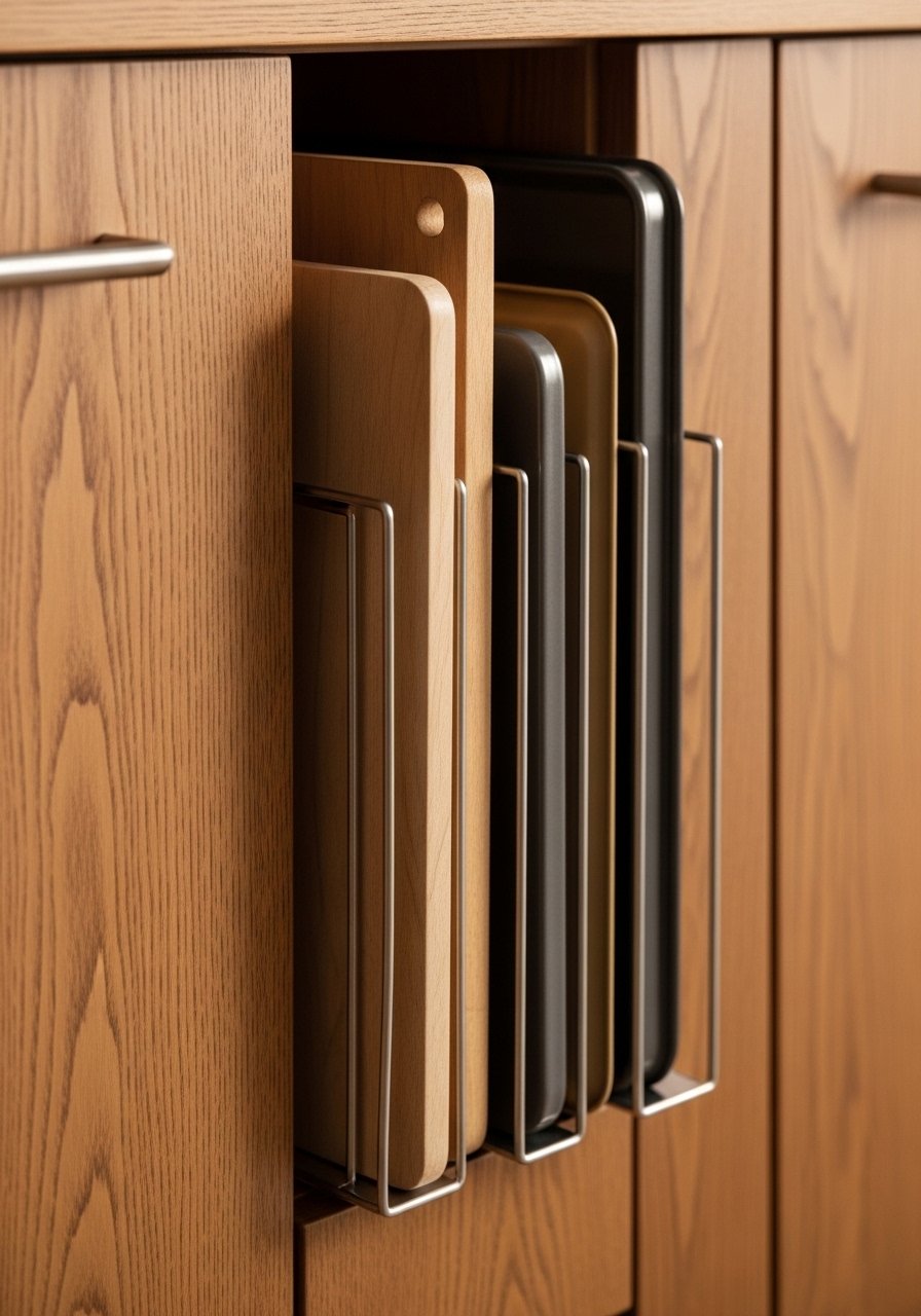 I mounted a slim magazine rack inside a cabinet to keep cutting boards upright. It stops boards from sliding and makes them easy to grab. Some racks are too narrow for thick boards. Measure your thickest board first. Budget $12-25. Try wall magazine rack repurposed.