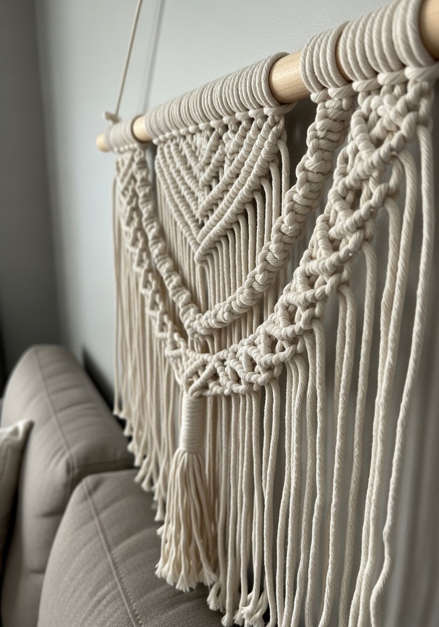 The moment I hung a large macrame above my couch, the room stopped looking unfinished. It adds vertical texture and fits a boho or modern farmhouse vibe. Budget ranges $20-60 depending on size. Use an odd number of hanging elements on a gallery wall for balance. Avoid tiny, overly intricate macrame that disappears in photos. I paired mine with white oak floating shelves and a 36-inch round mirror to keep the wall from feeling heavy.