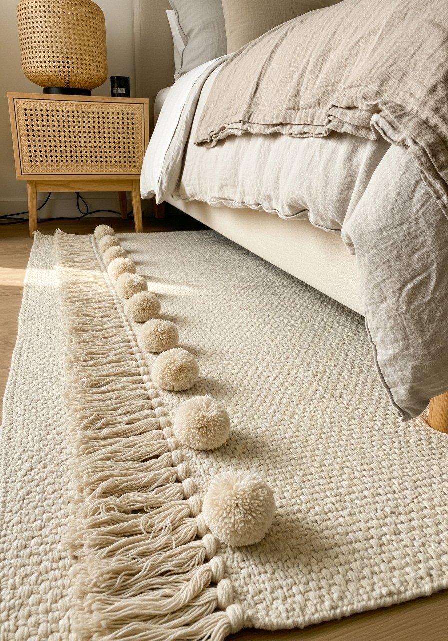 There is something about oversized texture that makes a bedroom want to be lingered in. I used a pom-pom edged rug about 8×10 feet and it anchors the bed. In photos it reads plush. In real life it traps dust faster. Plan for vacuuming more often. For small rooms, choose a 5×7 to avoid crowding. I bought a 5×7 pom-pom rug and loved the handfeel.