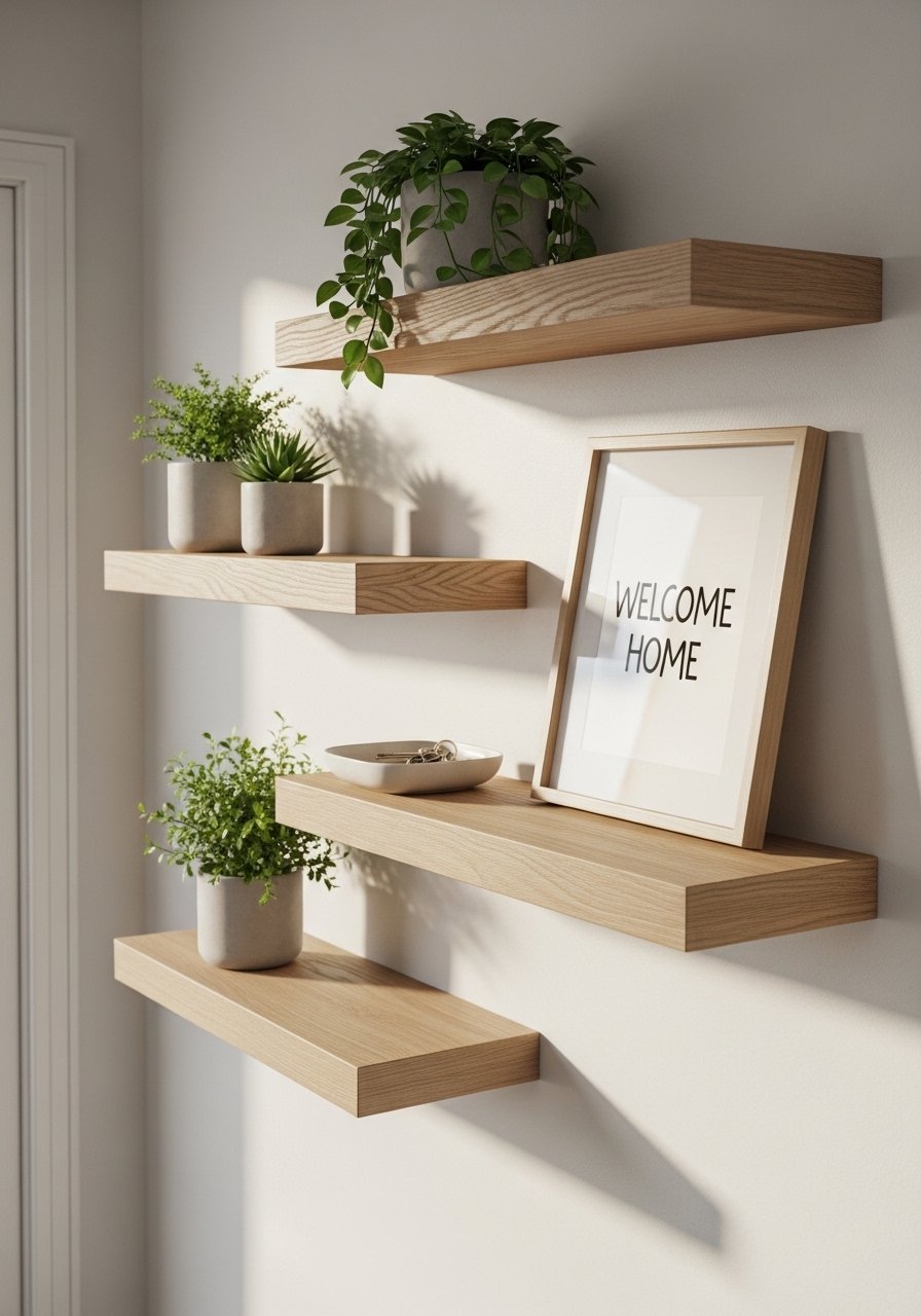 I keep seeing white oak shelves in showrooms this year. They make an entryway feel current without dominating the space. Stagger heights with one 8-inch height variation between shelves for depth. Budget $50-90 depending on size. The mistake is overloading them with objects of the same height. Mix books, a small plant, and a shallow tray for keys. I used white oak floating shelves set and they held up well.