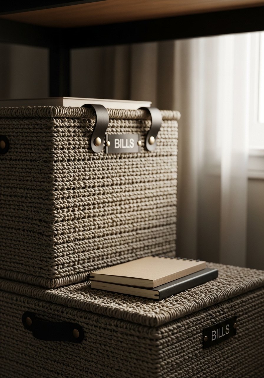 I replaced mismatched boxes with woven baskets that have leather handles. They look tidy in photographs and hold paper clutter in real life. Budget $25-60 for a set. Avoid overly small baskets that require constant reorganization. For small offices, use one large basket and one medium basket for balance. I like woven storage baskets with leather handles.