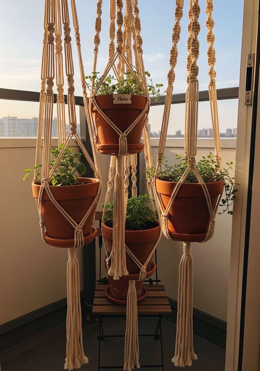A trio of hanging plants changed a tiny balcony into a green nook. I used height variation, about 6 to 12 inches between pots, to avoid a flat line. In photos it looks layered and lush. In reality you must water carefully to avoid drips on flooring. For small spaces, keep planters under 8 inches wide. Try cotton macrame plant hanger set.