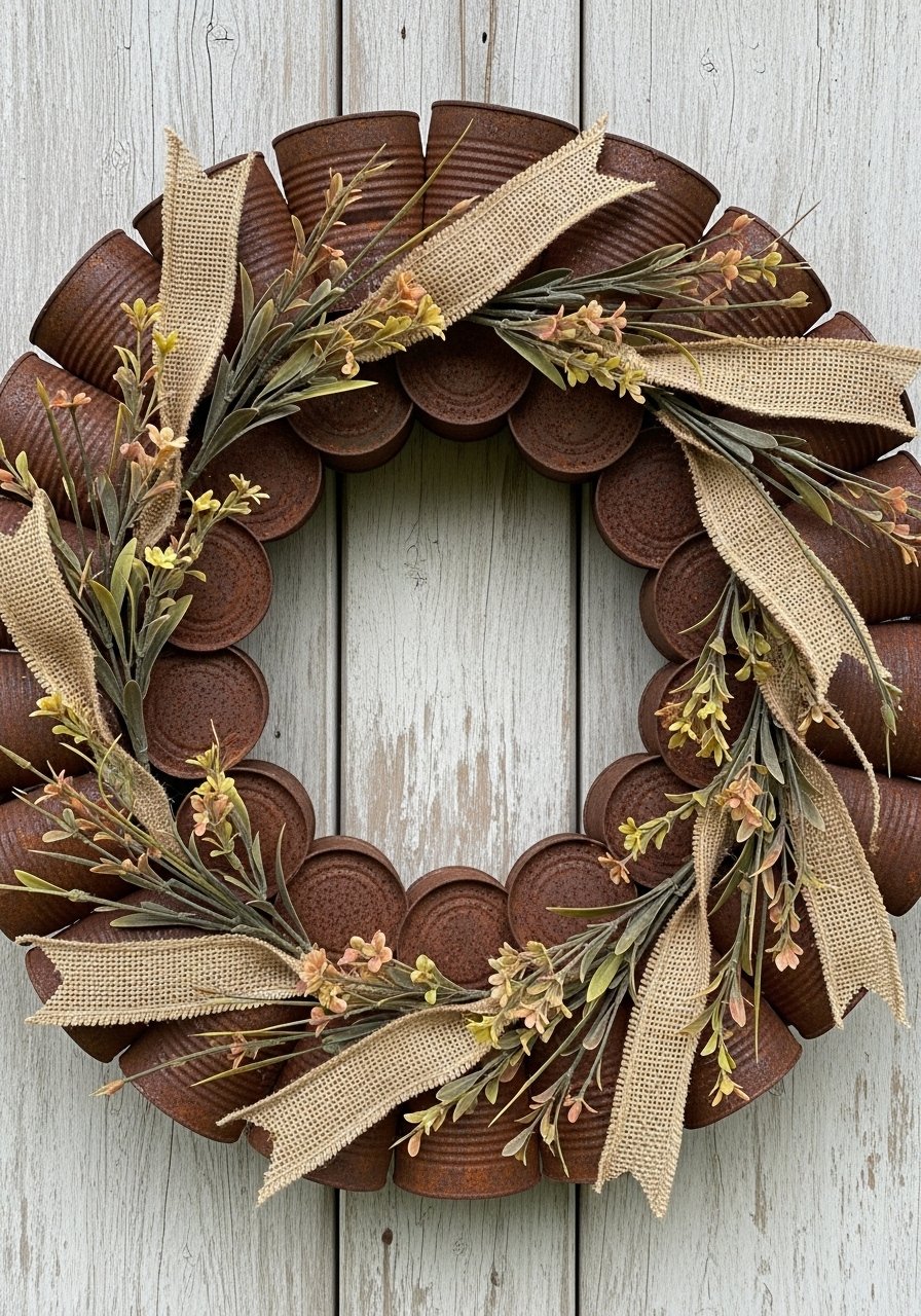 Rusted tin cans give instant aged patina that reads like a vintage find. I used a shallow metal wreath base and wired on sprayed-rusted cans filled with Dollar Tree stems to warm my entry. I linked this burlap ribbon I like to finish the hanger. Avoid over-cluttering—one wreath with three cans reads balanced; too many bits looks chaotic. This is eco-friendly and budget home decor that adds texture and seasonal warmth without buying new ceramics.