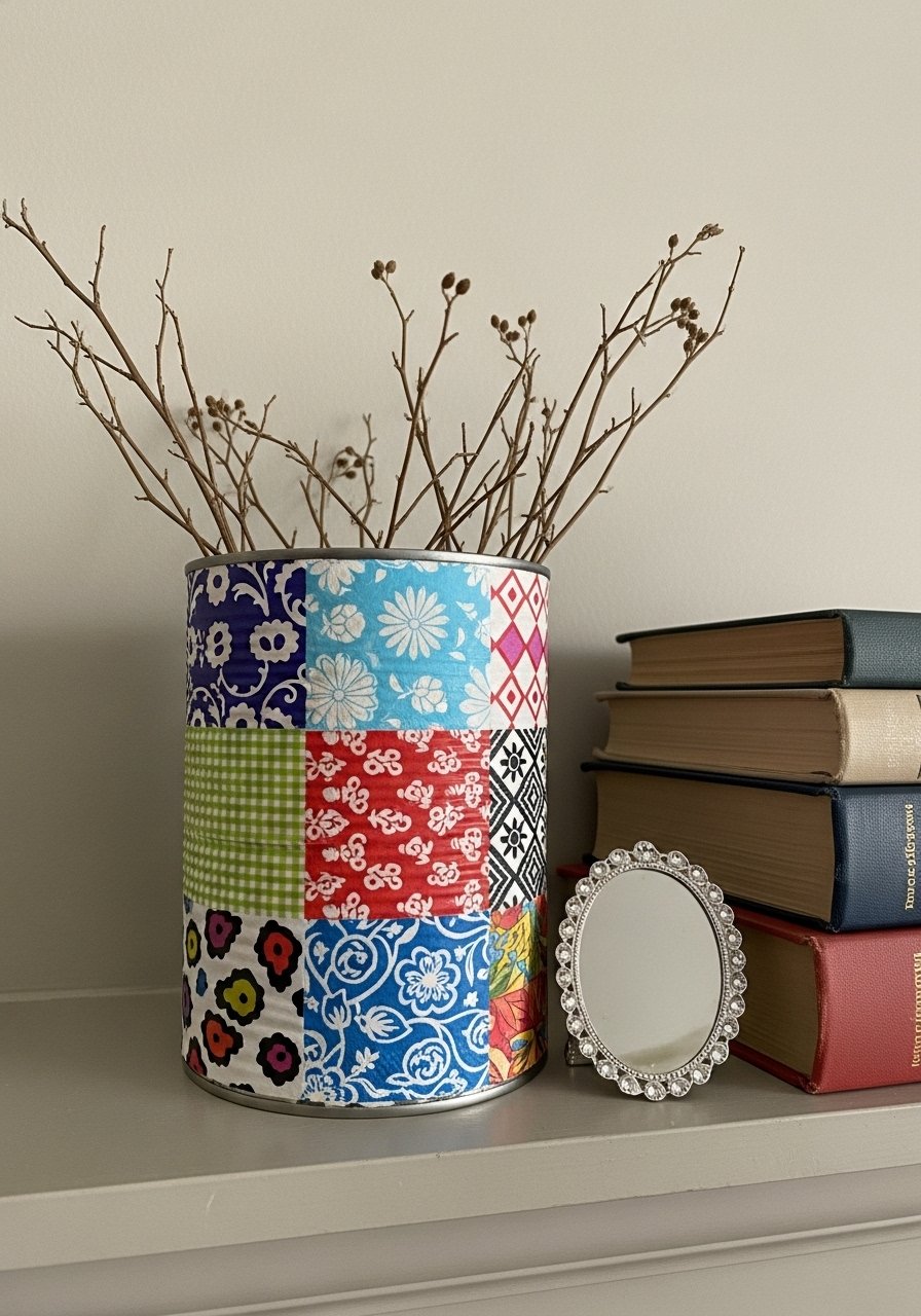 Napkin Decoupage Tin Can Centerpiece for Eclectic Tables