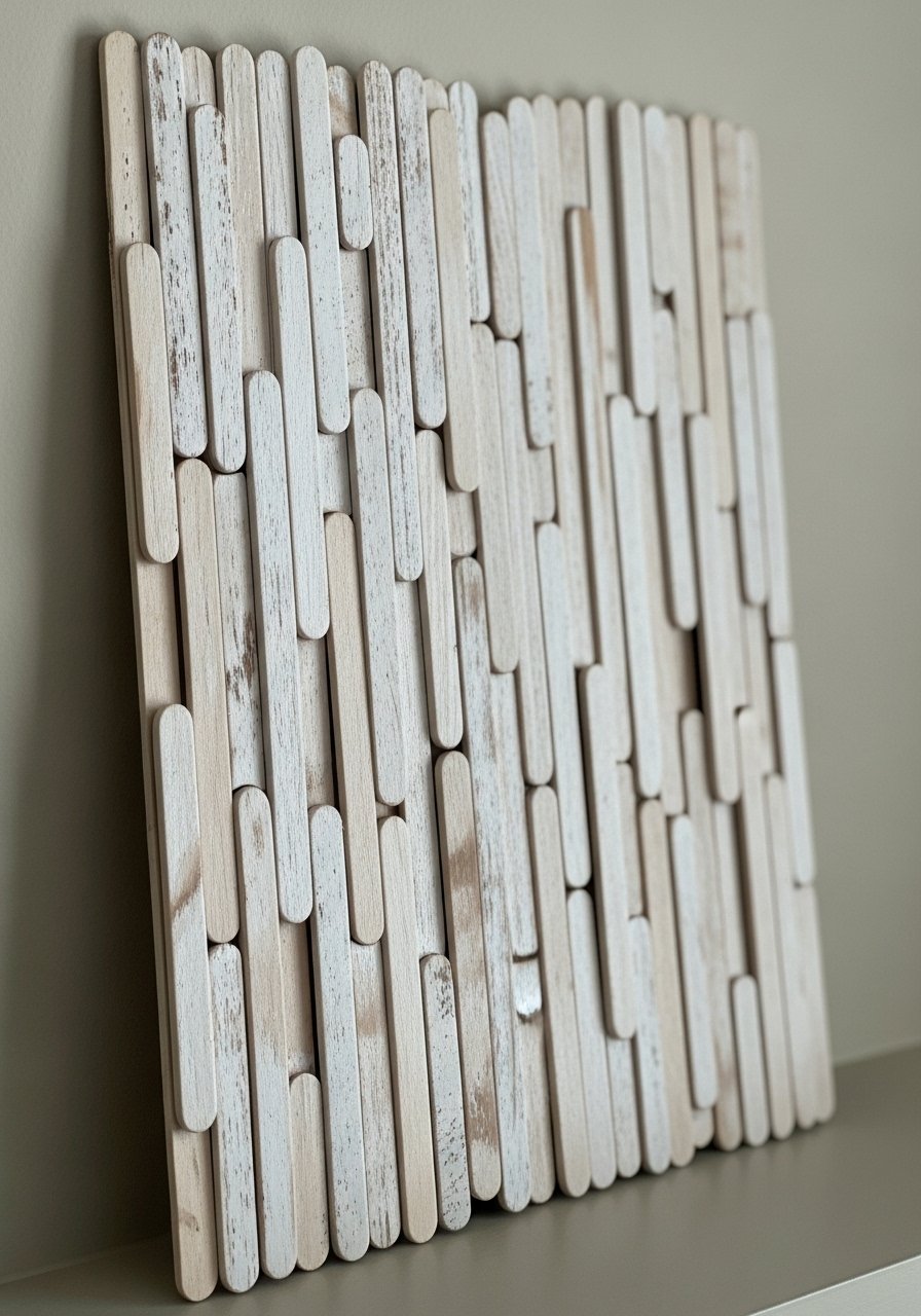 Popsicle sticks become textured wall plaques when layered on a thin wood panel and whitewashed. I used odd-number groupings for visual interest and paired them with this white paint in a matte finish. Mistake: making sticks parallel; stagger them for depth. It’s a cheap, low-commitment artwork that adds height and texture to small spaces without cluttering.