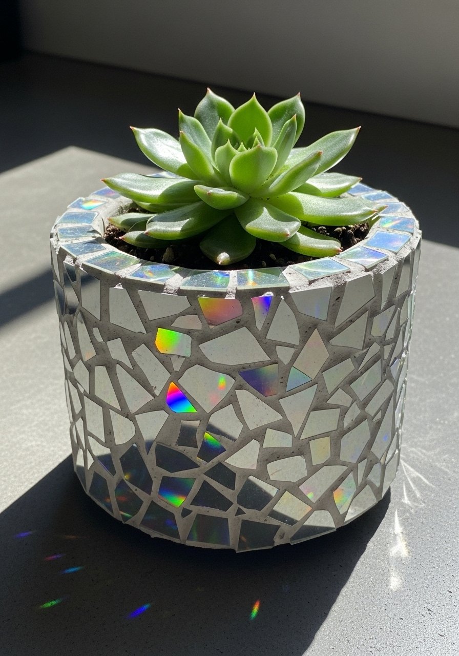 I cut old CDs into small tiles and embedded them in a concrete planter for reflective texture. Use these small succulents to complete the look. Mistake: sharp edges—sand carefully to avoid cuts. This reclaimed-shine piece reads modern and pairs nicely with mixed metallic accents.