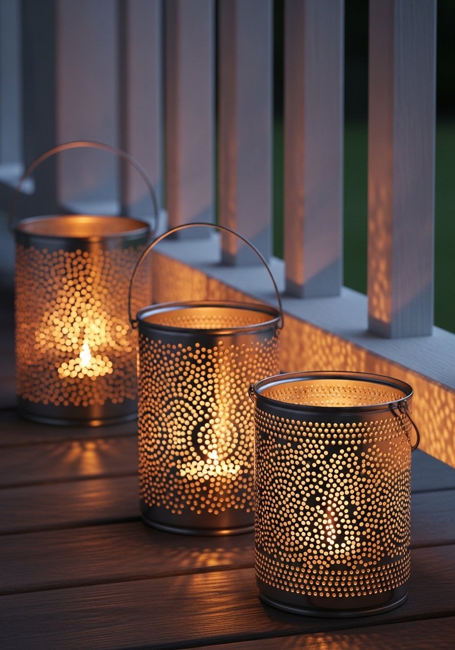 I punched patterns into tin cans, added tea lights, and placed them along the porch for warm, patterned light. I use battery tea lights for safety. Mistake: thin walls can warp—choose cans with even thickness. These lanterns add cozy evening ambience and read like thoughtful, handcrafted lighting.