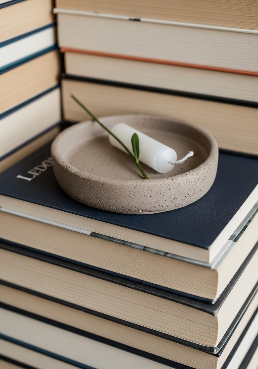I stack thin paperbacks and top them with a clay dish and candle for a curated tray. I use this cream pillar candle and it keeps the look intentional. Mistake: too many titles—limit to 2–3 books for scale. This is a practical way to add height and grounding without buying new trays.