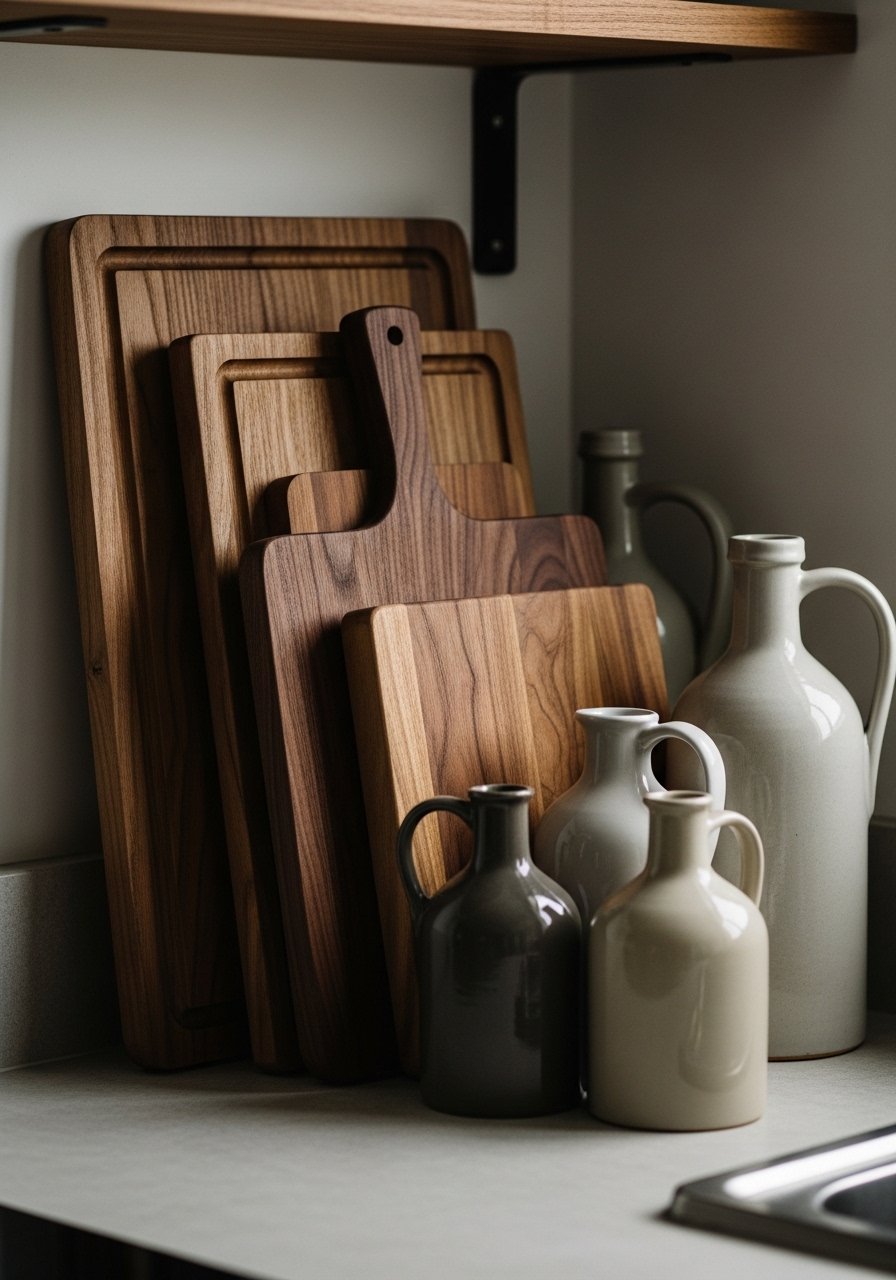 Mistake I made: first I leaned the wrong size board and it blocked lower shelves. Choose a board that leaves breathing room on the shelf edge. The wood warmth cuts through white dishes and makes the space feel intentional.