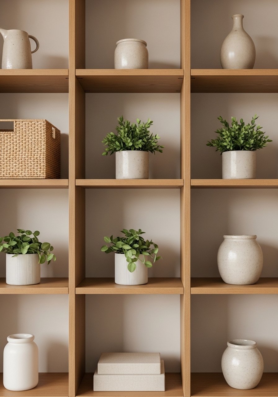 Shelves should feel useful and calm. Small swaps — one plant, a basket, a riser — make the biggest difference.